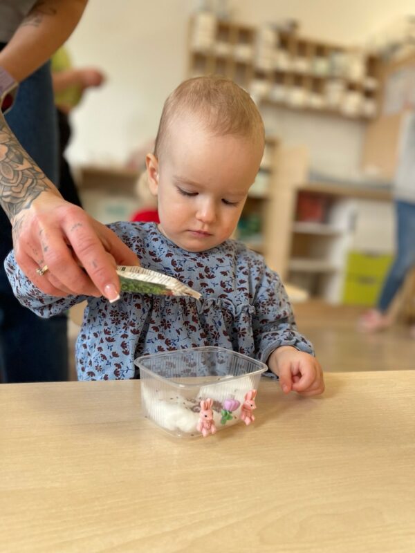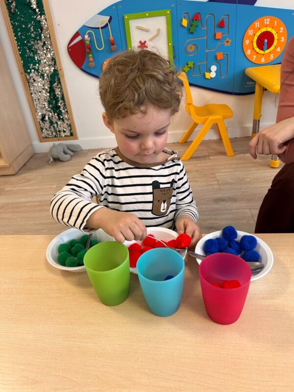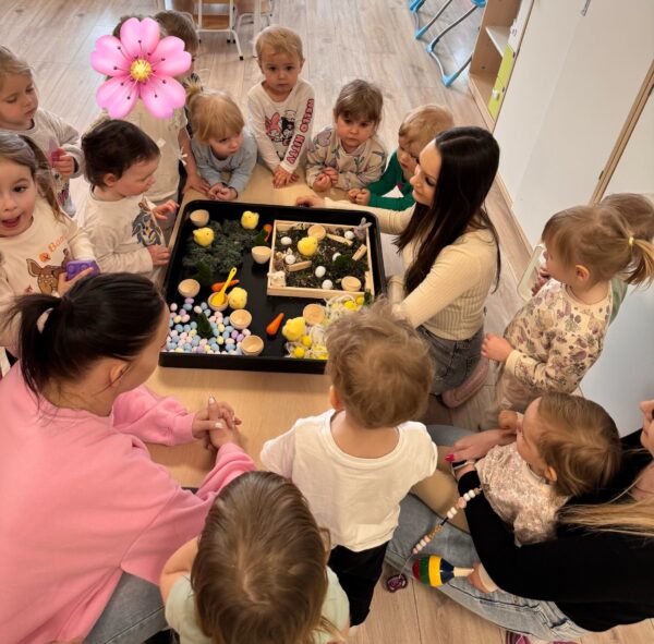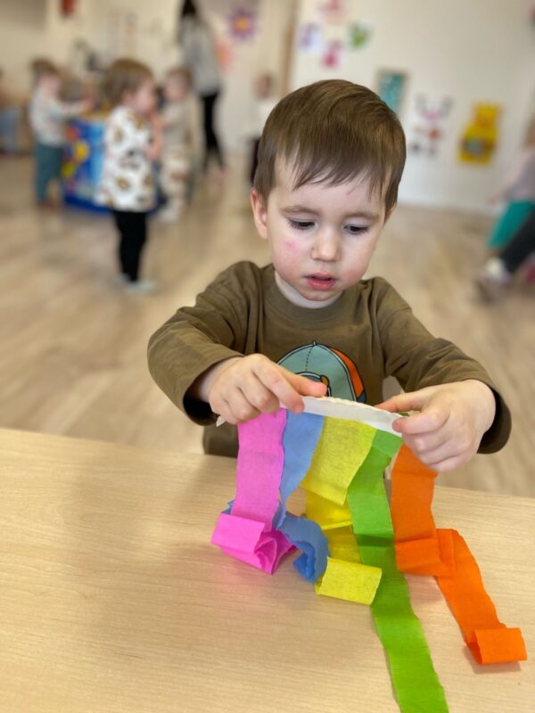 Nasze Liski bawiły się kolorami. Dzieci stworzyły tęczowe meduzy, którymi później ozdobiły ściany korytarza. Chłopiec siedzi przy stoliku, w dłoni trzyma przecięty na pół papierowy talerzyk, do którego przykleił wcześniej paski kolorowej bibuły. Dziewczynka siedzi przy stoliku, do połówki papierowego talerza przykleja różowy pasek bibuły. Dziewczynka uśmiecha się. W dłoni trzyma przecięty na pół papierowy talerzyk, do którego przymocowała kolorowe kawałki bibuły.