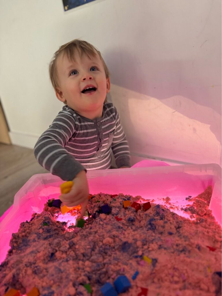 Chłopiec siedzi obok podświetlonego na różowo pudełka, w którym jest pełno piasku i różnych przedmiotów. Szuka dłońmi zabawek ukrytych w piasku.