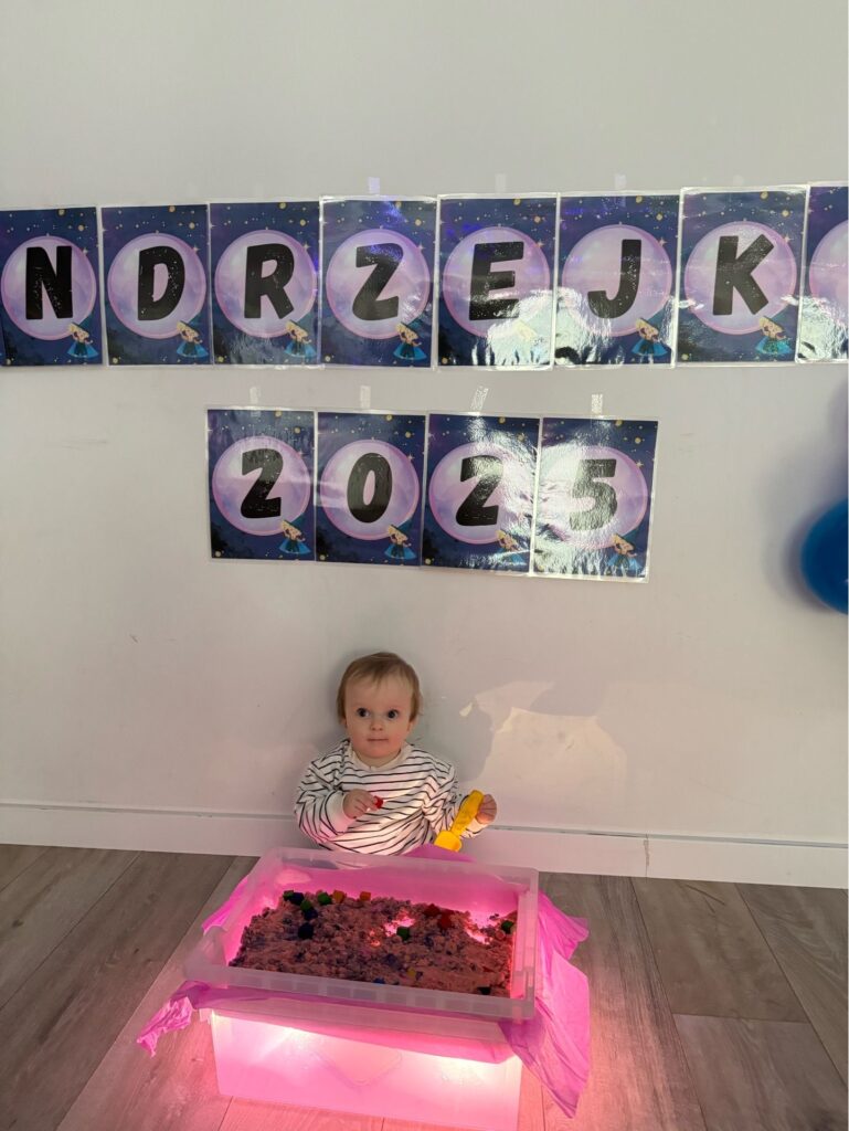 Dziewczynka siedzi pod girlandą z napisem „Andrzejki 2025”, przed nią stoi pudełko pełne piasku i różnych przedmiotów, oświetlone na różowo.