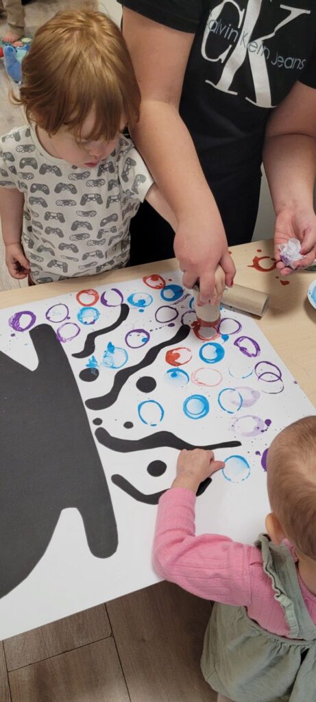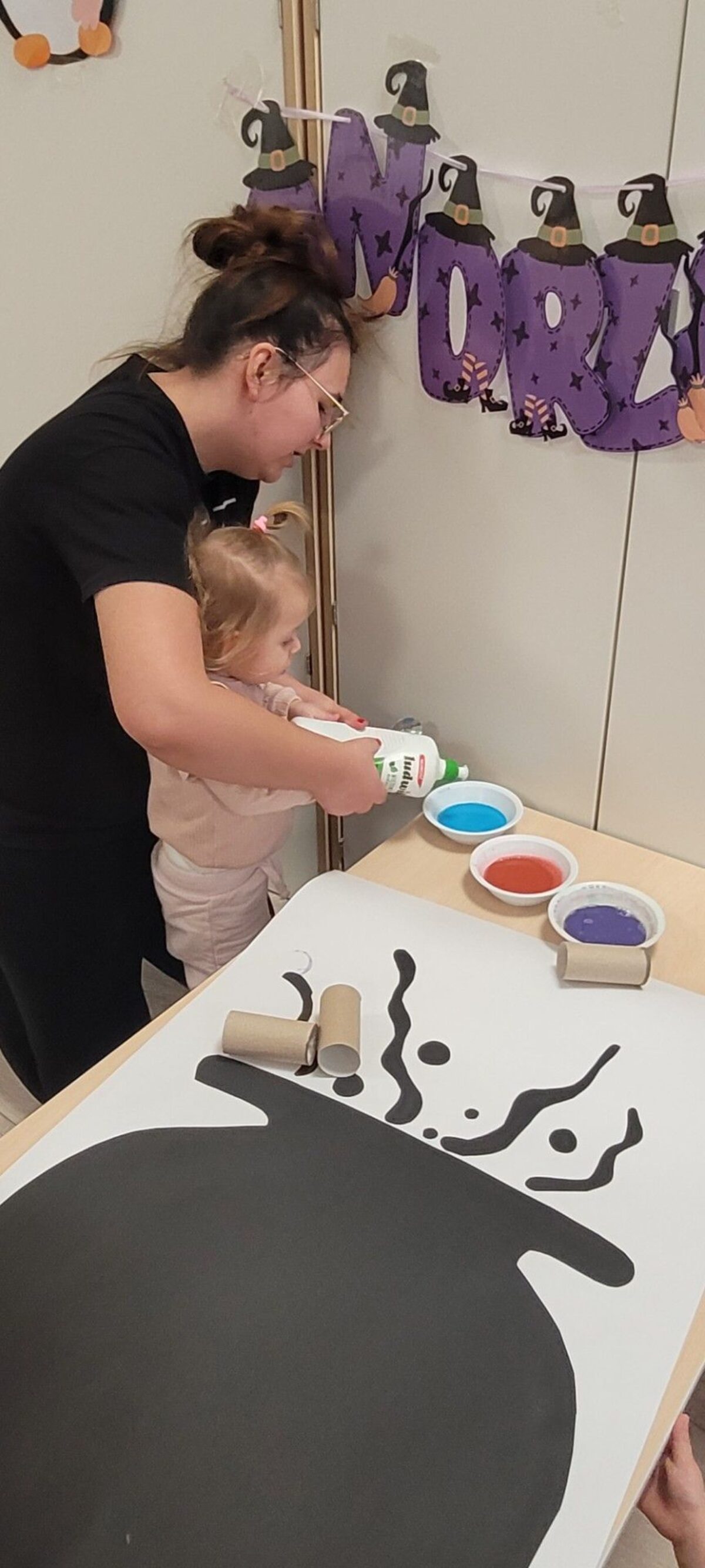 Dzieci siedzą przy stoliku, na którym leży namalowany kociołek. Odciskają kolorowe kółka za pomocą tutki po papierze toaletowym.Pani nalewa barwniki oraz płyn do naczyń do miseczek, na stole obok leży rysunek kociołka. Nad stołem wisi napis „Andrzejki”.