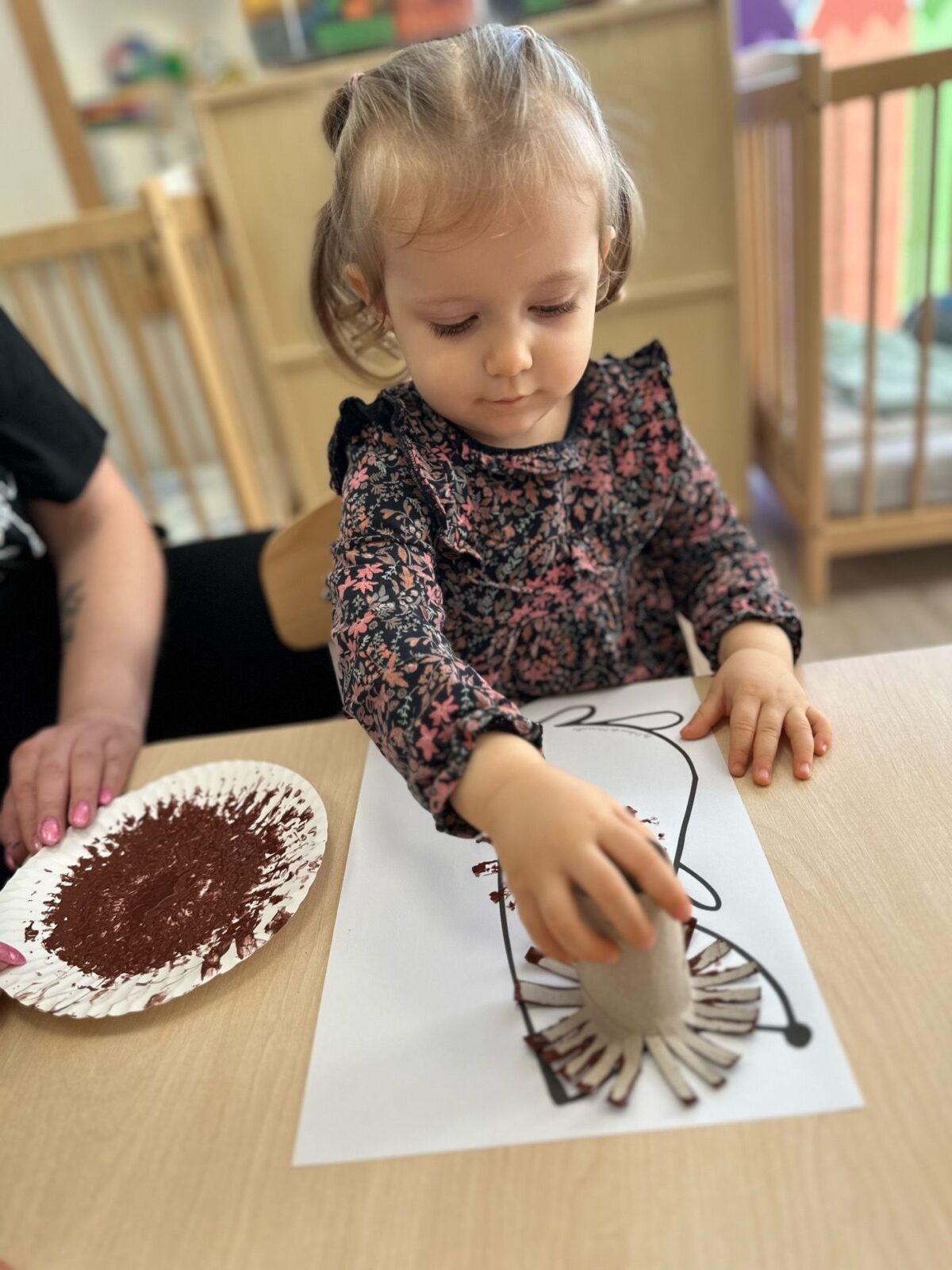 Dziewczynka siedzi przy stole, przykłada do kartki z obrysem jeża pociętą w paski tutkę po papierze toaletowym nasiąkniętą brązową farbą.Chłopiec trzyma w dłoni tutkę po papierze toaletowym, odciska nią ślady kolców na szkicu jeża znajdującym się na kartce papieru.