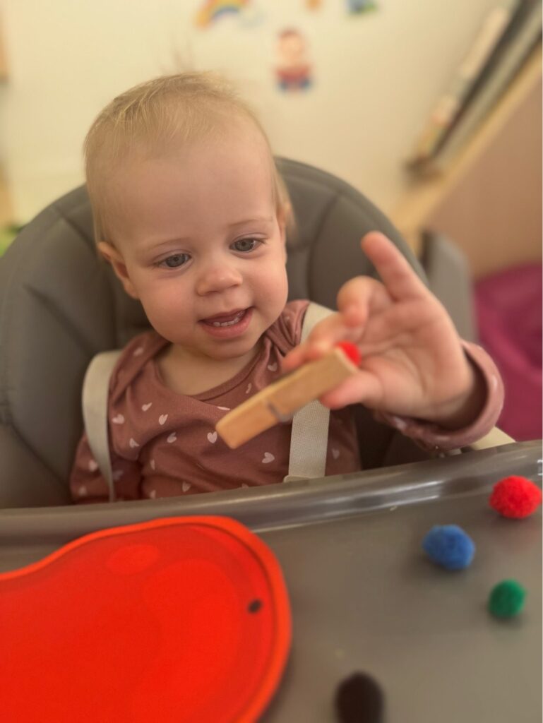 Dziewczynka siedzi w krzesełku do karmienia, przed nią leży wycięte z papieru czerwone jabłko. Dziecko trzyma w dłoni spinacz do bielizny, obok papierowej wycinanki leżą kolorowe kulki z pluszu.