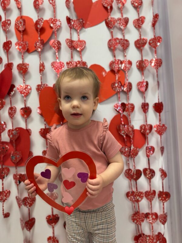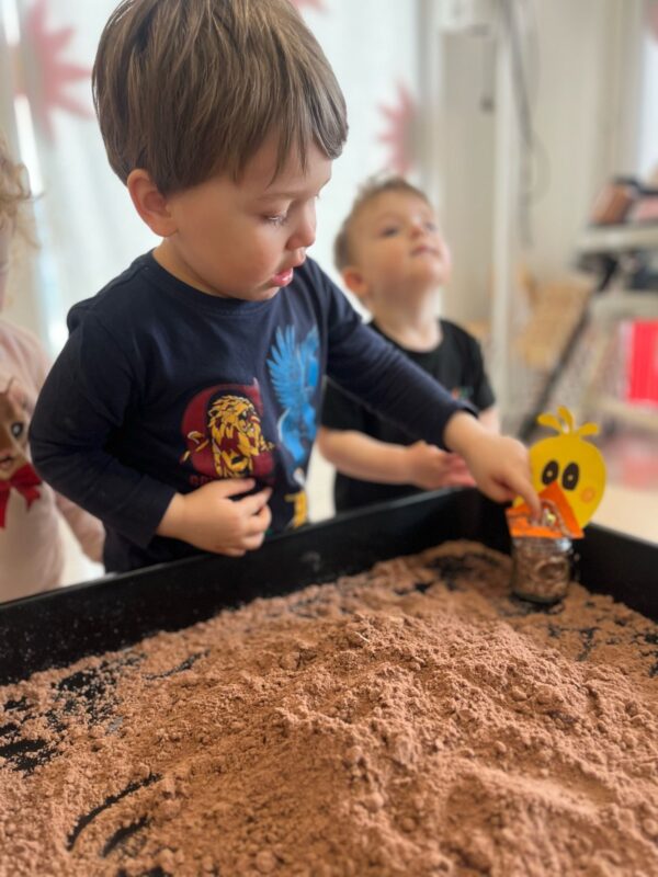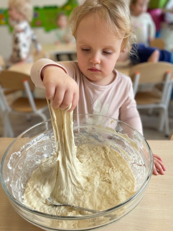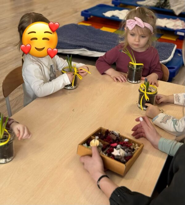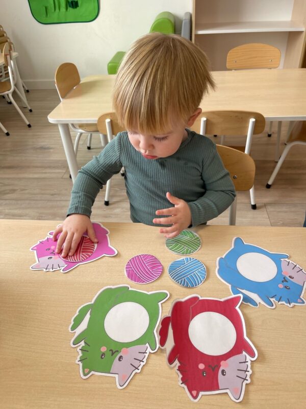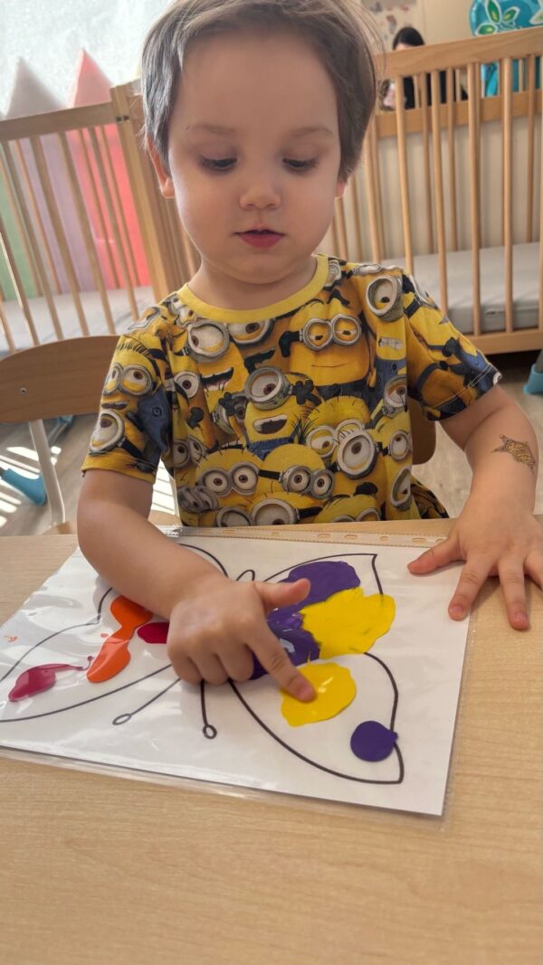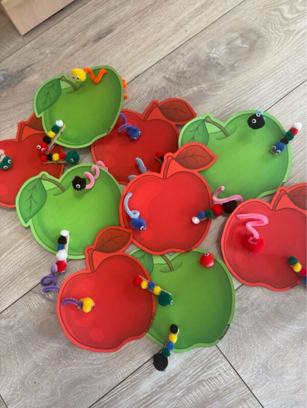Nasze Zajączki obchodziły Dzień Robaka- dzieci z pomocą Cioć wykonały papierowe jabłuszka i przymocowały do nich drucikowe robaki! Dziewczynka siedzi w krzesełku do karmienia, przed nią leży wycięte z papieru czerwone jabłko. Dziecko trzyma w dłoni spinacz do bielizny, obok papierowej wycinanki leżą kolorowe kulki z pluszu. Na podłodze leżą prace plastyczno- sensoryczne przedstawiające jabłka z papieru i robaczki zrobione ze spinaczy do bielizny i kolorowych drucików i pluszowych kulek.