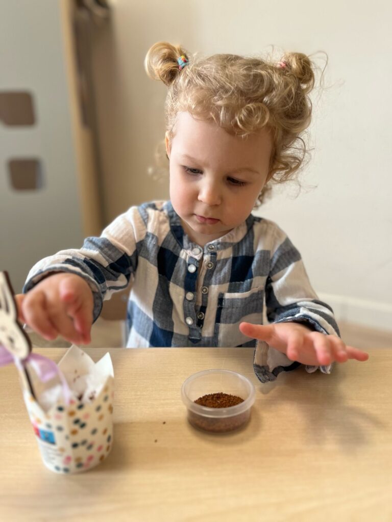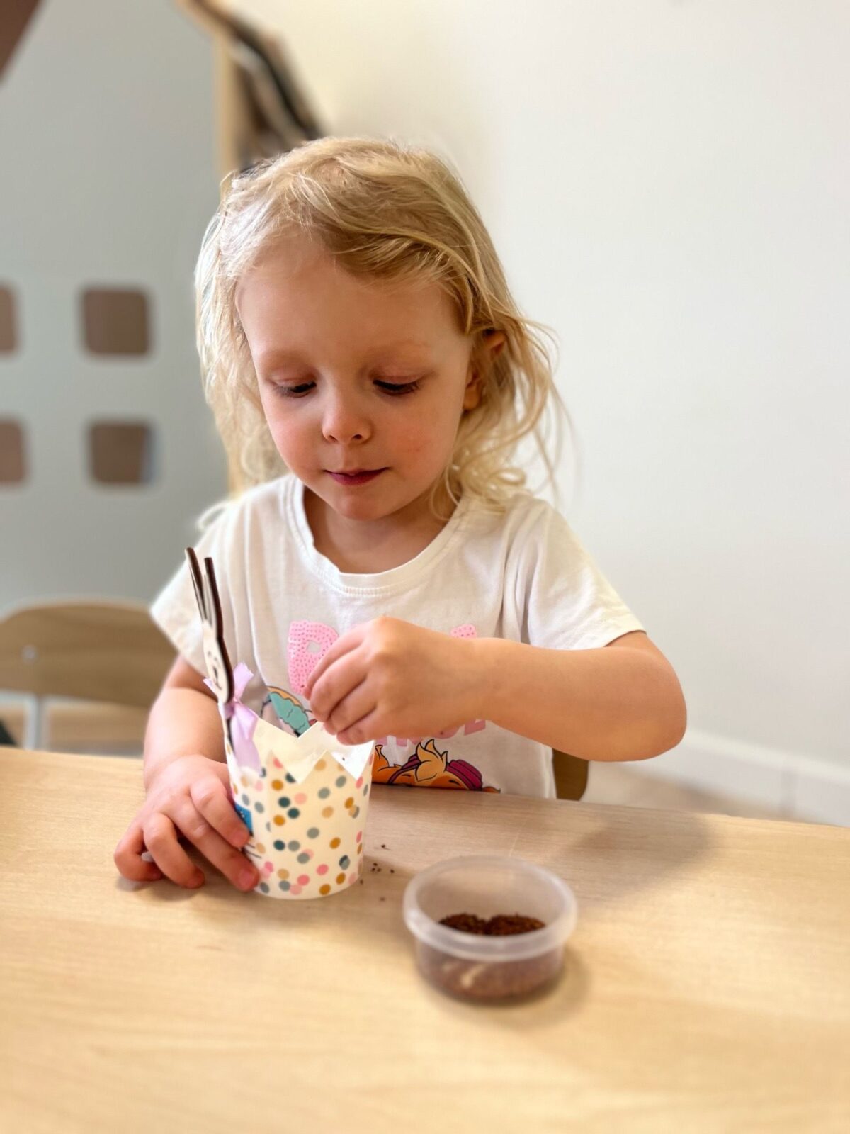 Dziewczynka siedzi przy stole, w dłoni trzyma nasiona rzeżuchy. Wsypuje nasiona do kolorowego pudełka.