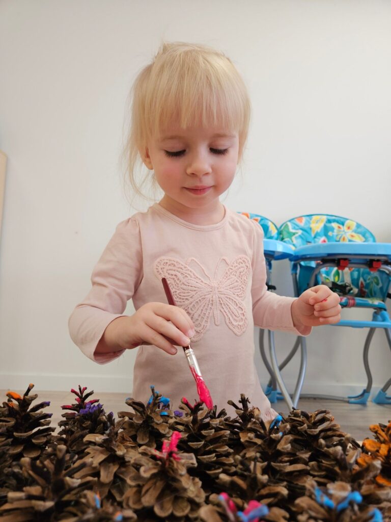 Dziewczynka stoi przy stole, w dłoni trzyma pędzel zanurzony w różowej farbie. Koloruje szyszki przyklejone do jeża wyciętego z kartonu.