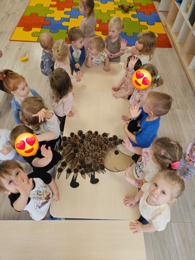 Dzieci siedzą przy stole, na środku stołu leży jeży wycięty z kartonu. Na plecach jeża przyklejone są szyszki.