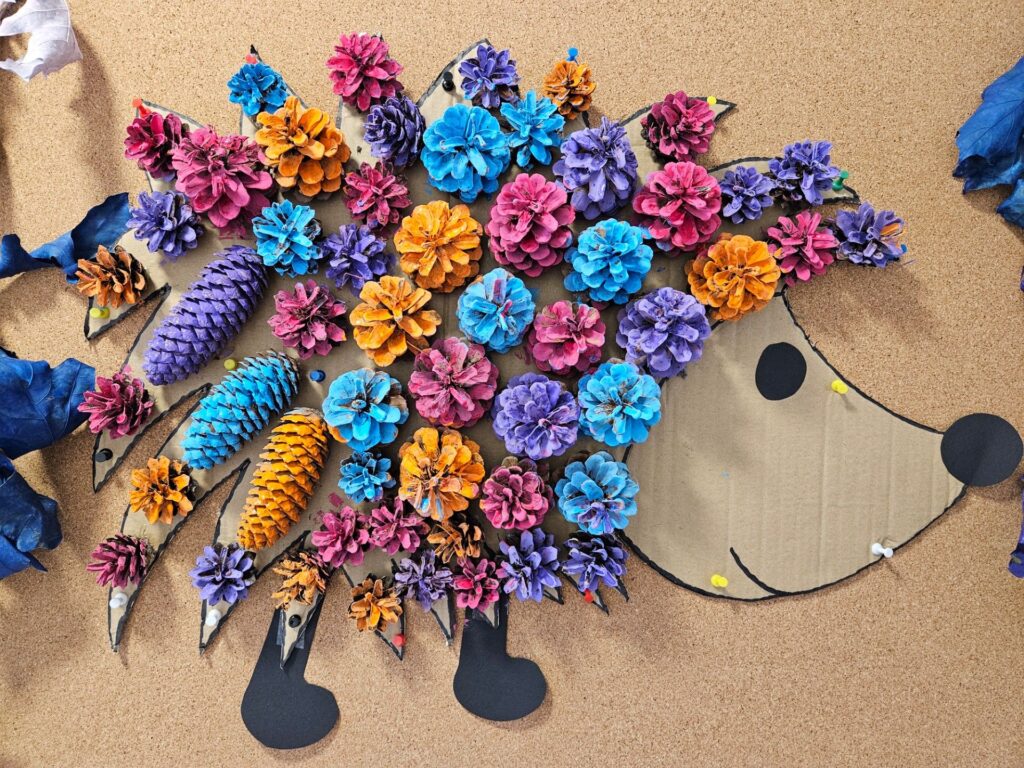 Zdjęcie przedstawia jeża wyciętego z kartonu, do którego pleców przyklejono szyszki pomalowane na niebiesko, pomarańczowo, fioletowo i różowo.