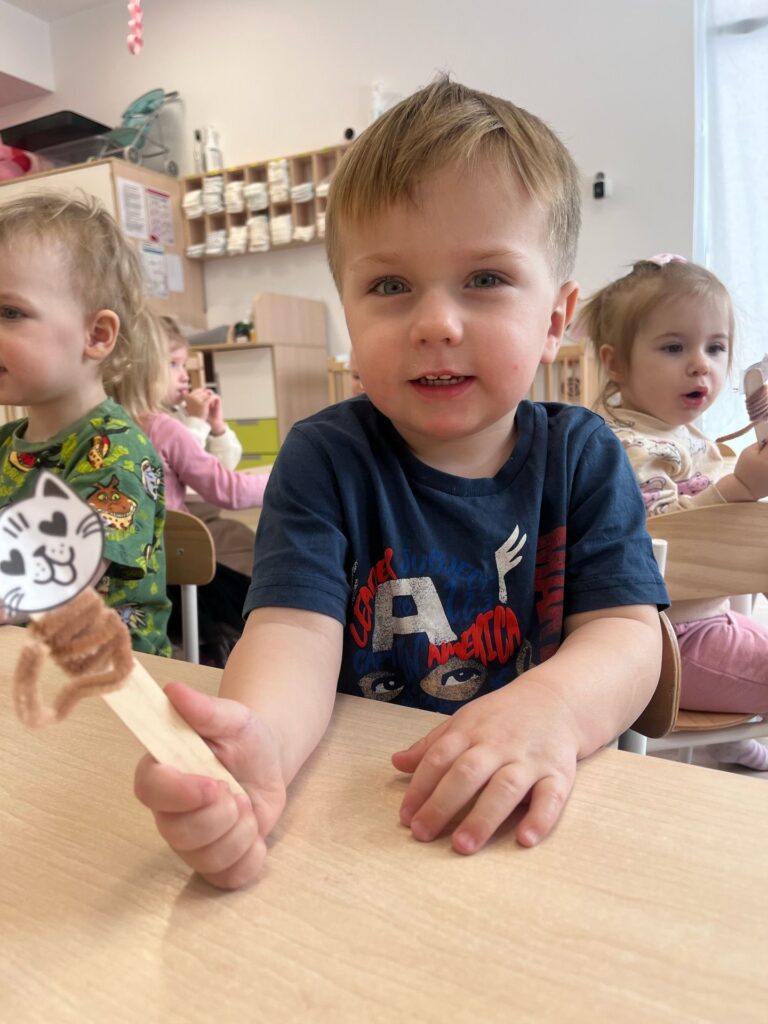 Dzieci siedzą przy stolikach, na pierwszym planie jest chłopiec, który trzyma kukiełkę przedstawiającą kotka. Papierowa głowa kota przyklejona jest do drewnianego patyczka laryngologicznego.