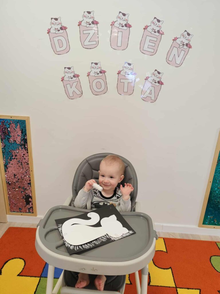 Dziecko siedzi w krzesełku do karmienia, w dłoni trzyma białą kredę. Przed chłopcem leży kartka papieru z sylwetką kota, którą dziecko ozdabia. Na ścianie w tle widnieje przyklejony napis „Dzień Kota”.