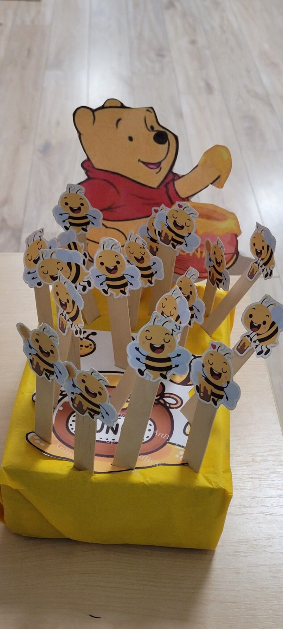 Na stole stoi pudełko z Kubusiem Puchatkiem i naklejką przedstawiającą baryłkę miodu. W pudełko wetknięte są pszczółki przyklejone do patyczków laryngologicznych.