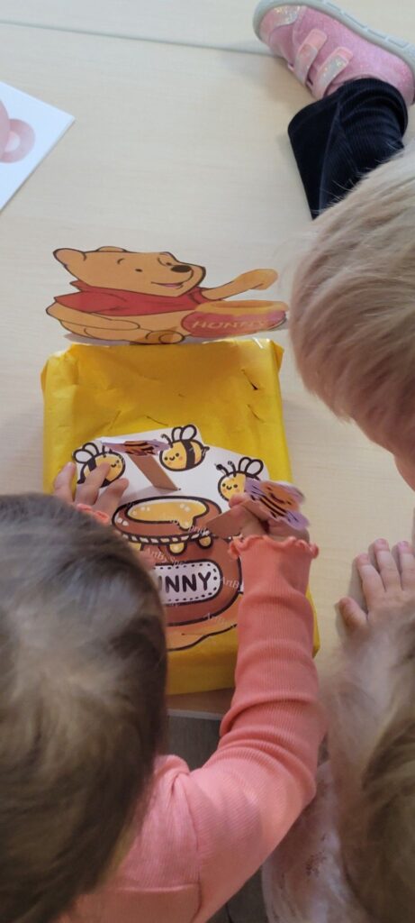Z okazji Święta Pluszowego Misia nasze Sarenki zrobiły swoje własne pluszaki z kartki papieru i waty. Dzieci pomagały również pszczółkom trafić do miodku- wraz ze słynnym misiem- Kubusiem Puchatkiem.