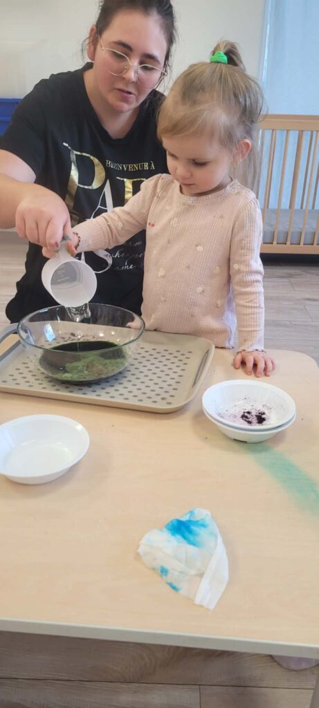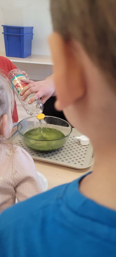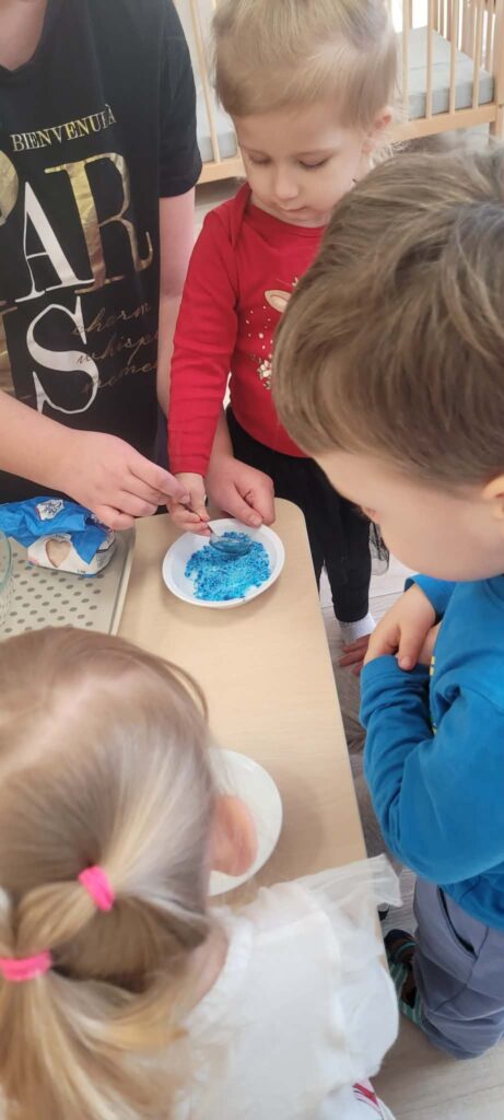 Dziecko wsypuje niebieski proszek do miseczki, inne maluchy przyglądają się temu.