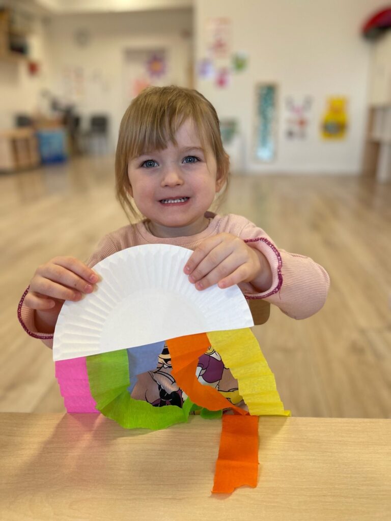 Dziewczynka uśmiecha się. W dłoni trzyma przecięty na pół papierowy talerzyk, do którego przymocowała kolorowe kawałki bibuły.