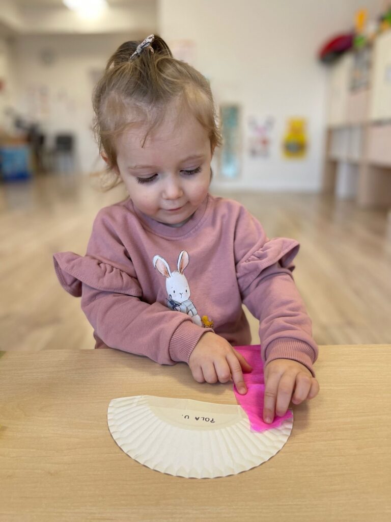 Dziewczynka siedzi przy stoliku, do połówki papierowego talerza przykleja różowy pasek bibuły.