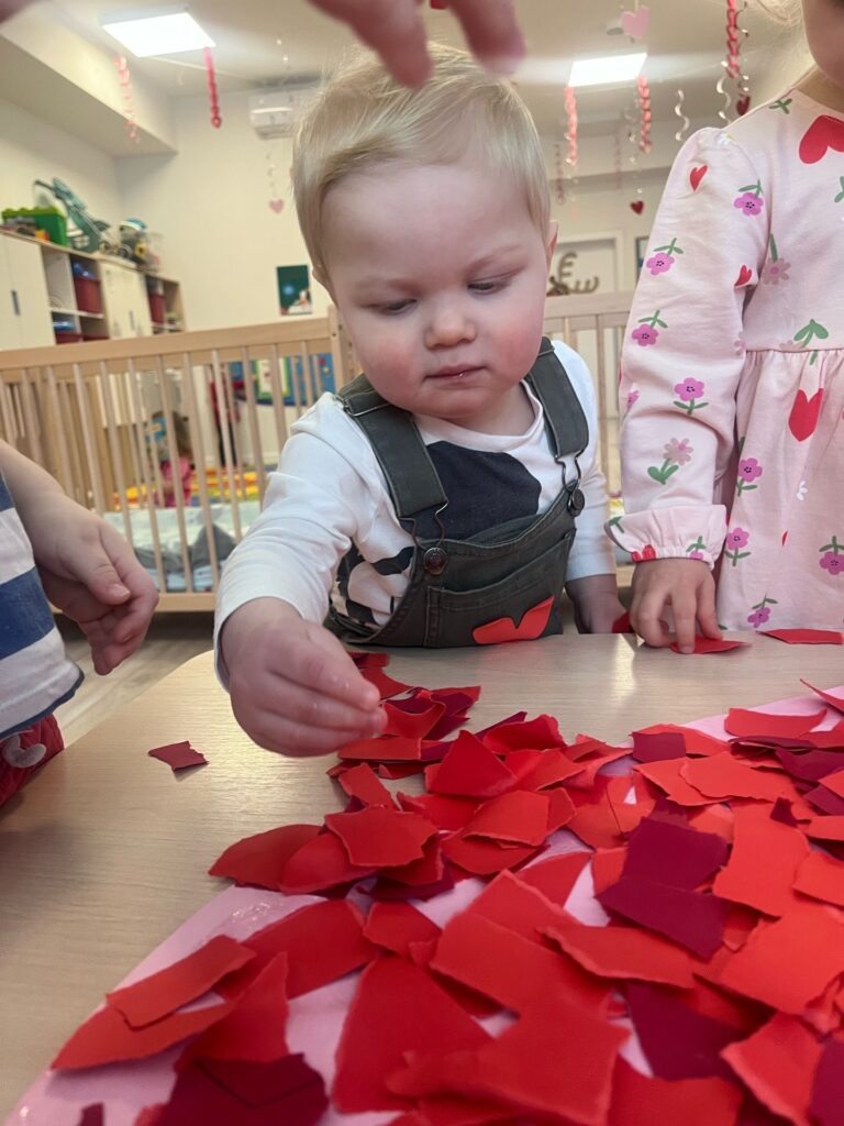 Chłopiec trzyma w dłoni strzępek czerwonej kartki, przykleja go do papierowego serca.