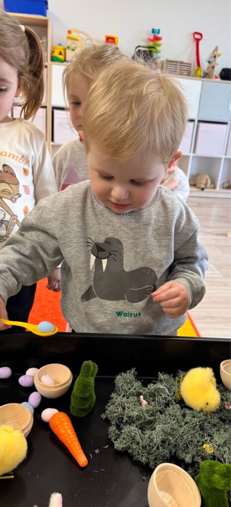 Chłopiec stoi przy stoliku, na którym znajduje się mech, drewniane jajka, kolorowe kulki z pluszu, pluszowe kurczaczki itp.