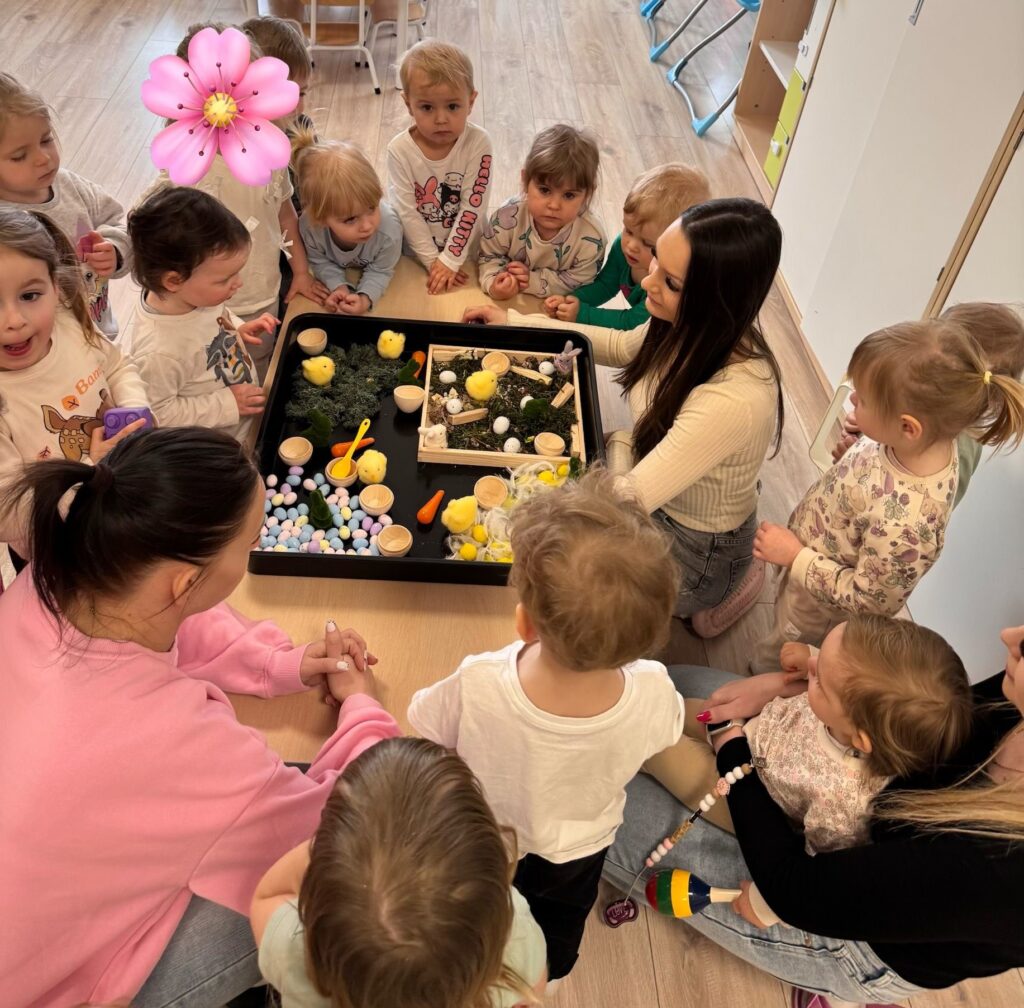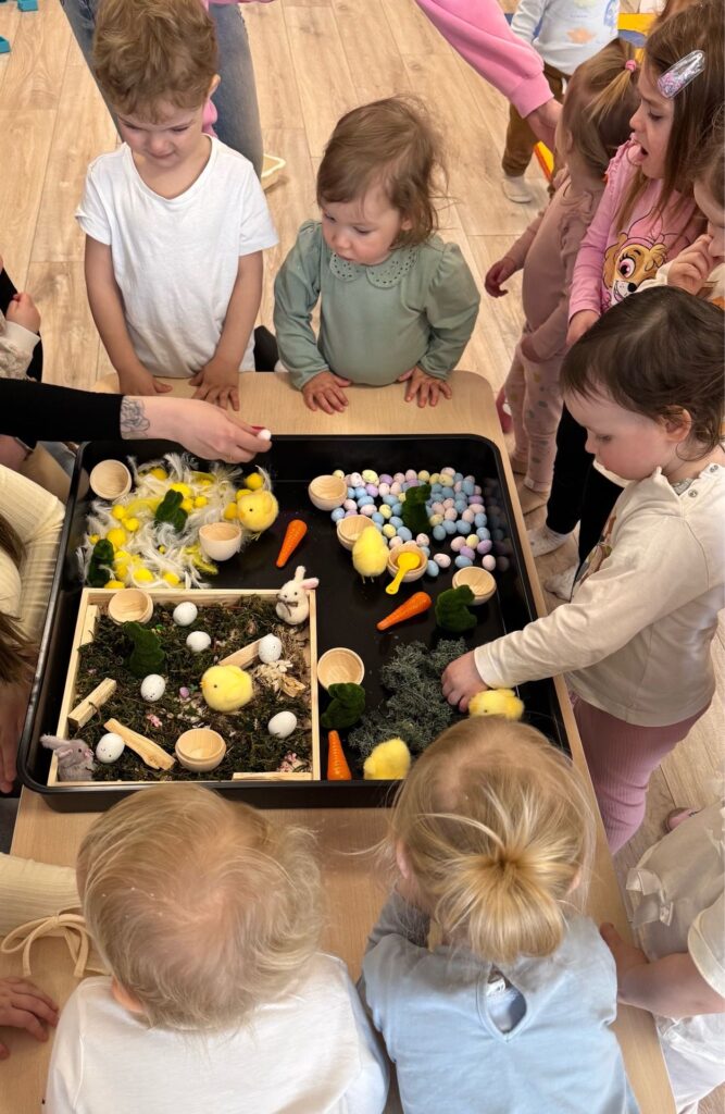 Dzieci i opiekunki siedzą wokół makiety wielkanocnej, bawią się przedmiotami znajdującymi się na stoliku.
