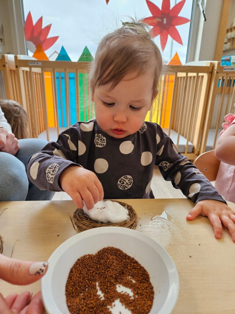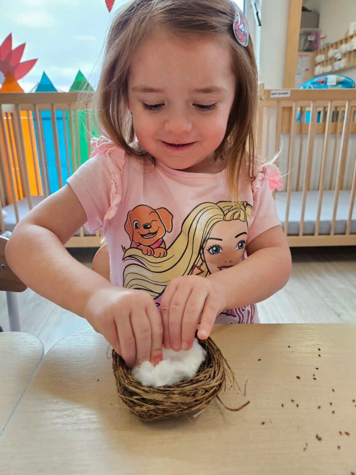 Dziewczynka siedzi przy stoliku, przed nią leży gniazdko z watą. Dziecko wsypuje nasiona rzeżuchy do gniazda.