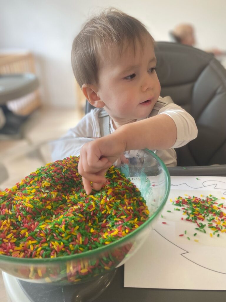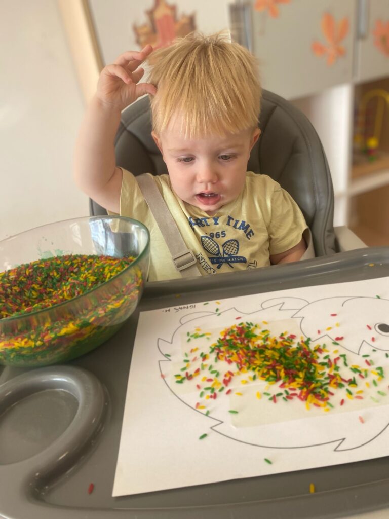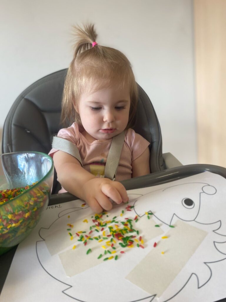 Zajączki przykleiły kolorowy ryż do kartki papieru ze szkicem jeża- dzieci oprócz wrażeń sensorycznych miały dużo zabawy związanej z tworzeniem pięknych, kolorowych prac plastyczno-sensorycznych.